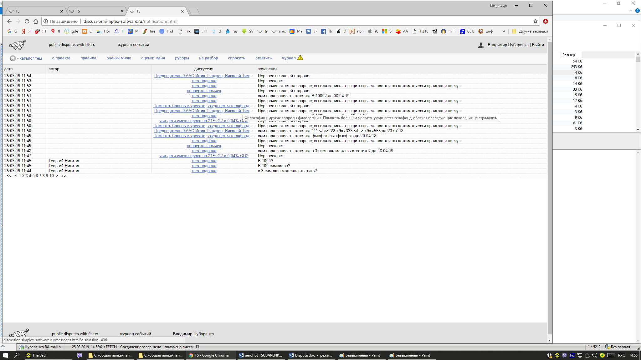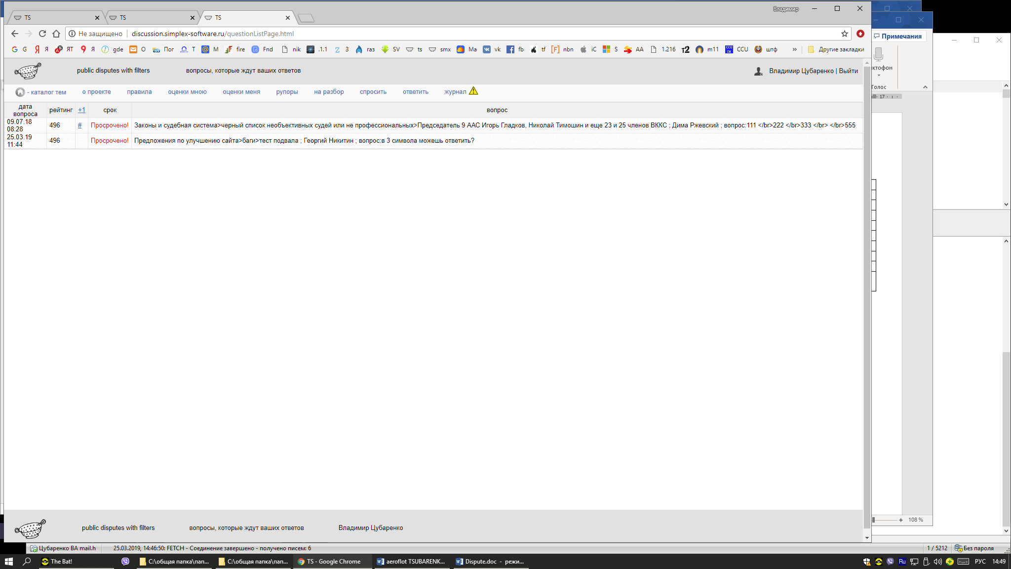 Там быдо так: сначала перел вопросами от георга которым я тестировал ответ с заданной длиной, было всего 3 вопроса обязательных. А по мере ответа на них вылезло еще как минимум 3 штуки перед георгом. Это странно. Для доказательства данного факта приложил журнал. Хотя с журналом тоже не все ясно. что там отображается? Названия события нет.(вопрос, ответ, или сообщение...) но все равно видно, что в ходе сеанса появились новые вопросы в списке по сообщениям типа "вам пора написать ответ". Так вот эти вопросы были добавлены в список после написания ответа ряд вопросов предыдущих. Возможно это и не ошибка. Возможно что-то с таймерами (отладка или произведен их запуск с момента моего входа). Но сообщаю о странном поведении очереди вопросов на ответ.