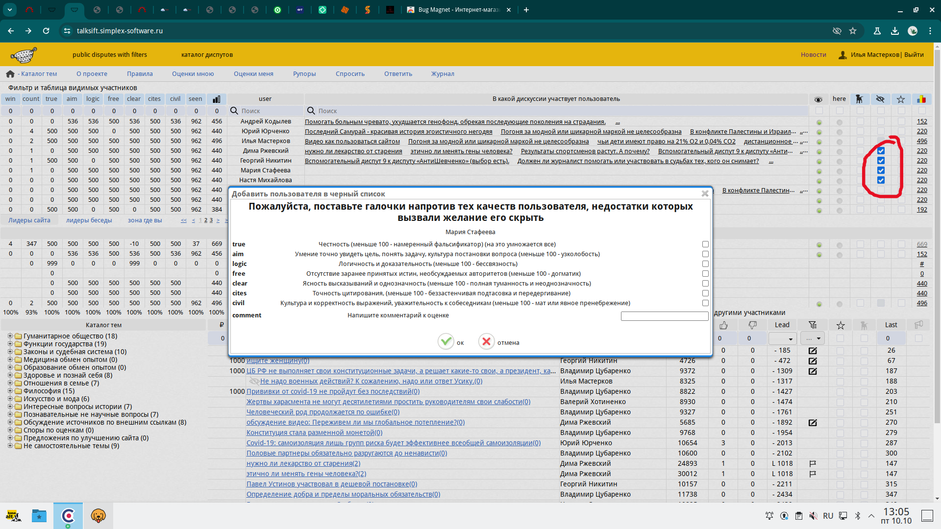 В таблице "В какой дискуссии участвует пользователь" справа есть иконка для скрытия пользователей(иконка закрытого глаза),где при быстром нажатии на галочки для скрытия пользователей, сайт прогружает модальное окно не сразу, надо это исправить