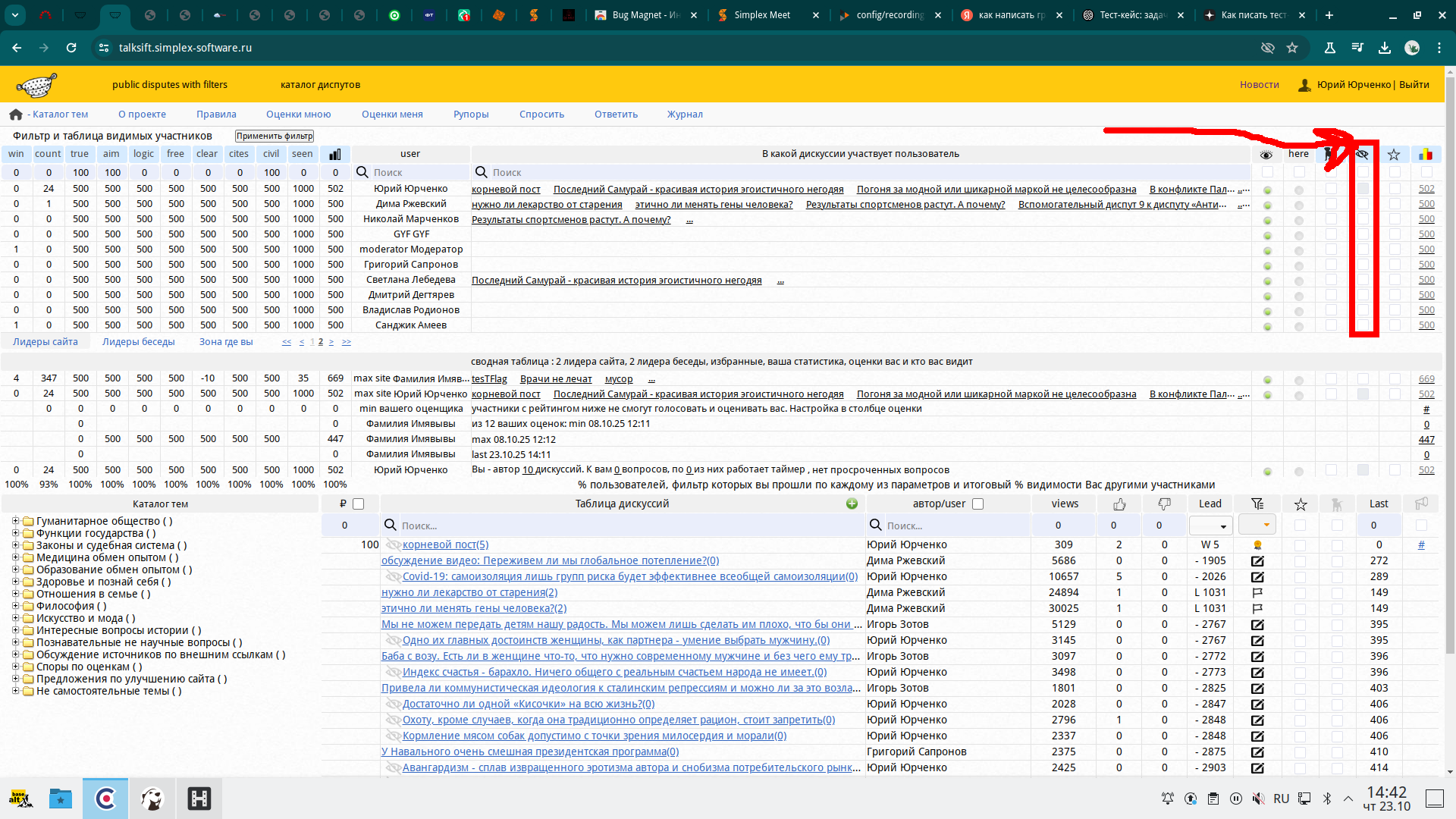 на главной странице тестового сайта https://talksift.simplex-software.ru/ в правом углу есть таблица фильтров, где нам нужна колонка "Скрыть" (иконка-перечеркнутый глазик), при выборе пользователя для скрытия нажимаем под иконкой пустое окно, после чего выходит окно для выбора и описания причины, по которой мы хотим скрыть пользователя, выбрав причину и нажав "Ок" видим что ничего не происходит, кроме того что оценка (самая крайняя колонка в этой таблице) снизилась, но пользователь не скрылся