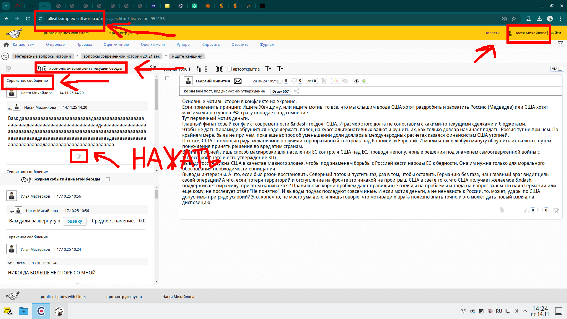Заходя в любую дискуссию, она через некоторое время делиться на две части страницы (верхняя-страница сайта и нижняя-страница дискуссии) под "хронологическая лента текущей беседы" и у уже существующего сервисного сообщения выбираем иконку под названием "ответить,задать вопрос", где после нажатия на кнопку "отменить", нам выдает ошибку.