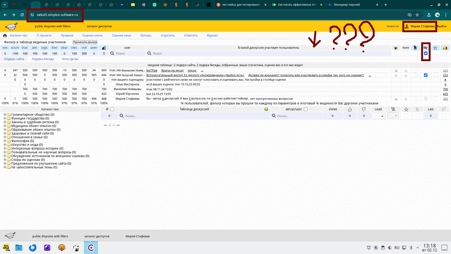 3) в таблице "В какой дискуссии участвует пользователь" скрыть одного пользователя из списка, нажав на галочку в одной линии строки с тем пользователем которого хотим скрыть под колонкой "Скрыть" (иконка в виде глаза)